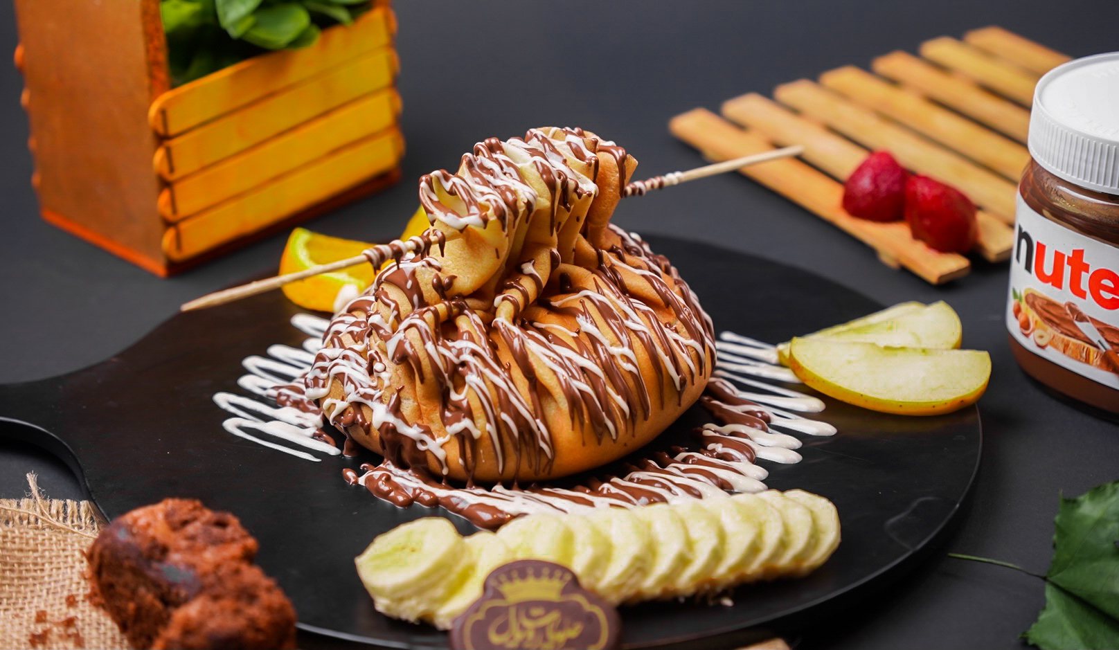 كريب محشي بالموز بشكل دائري ومغطى بالشكولا