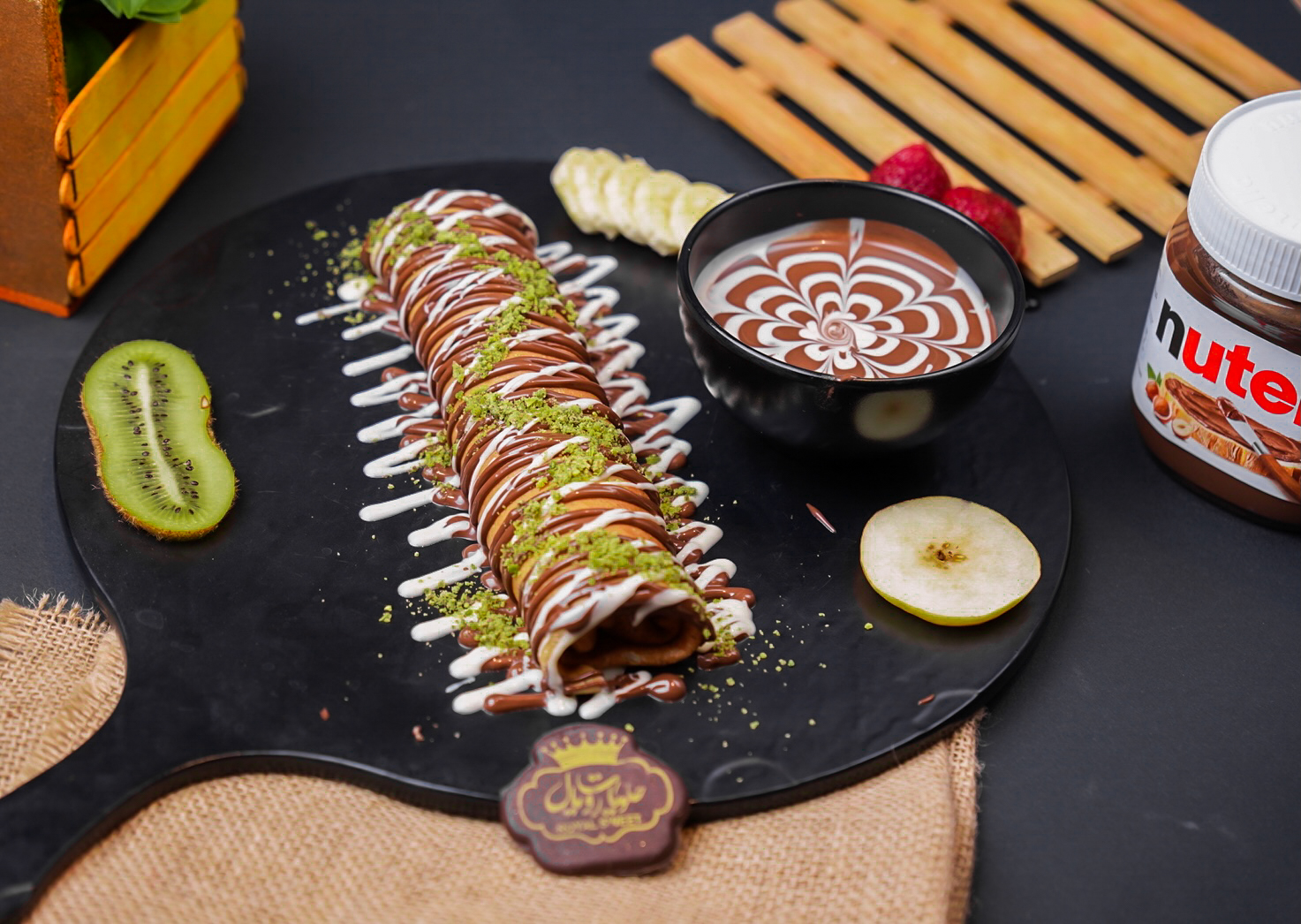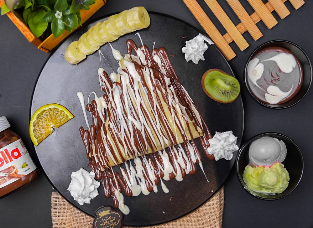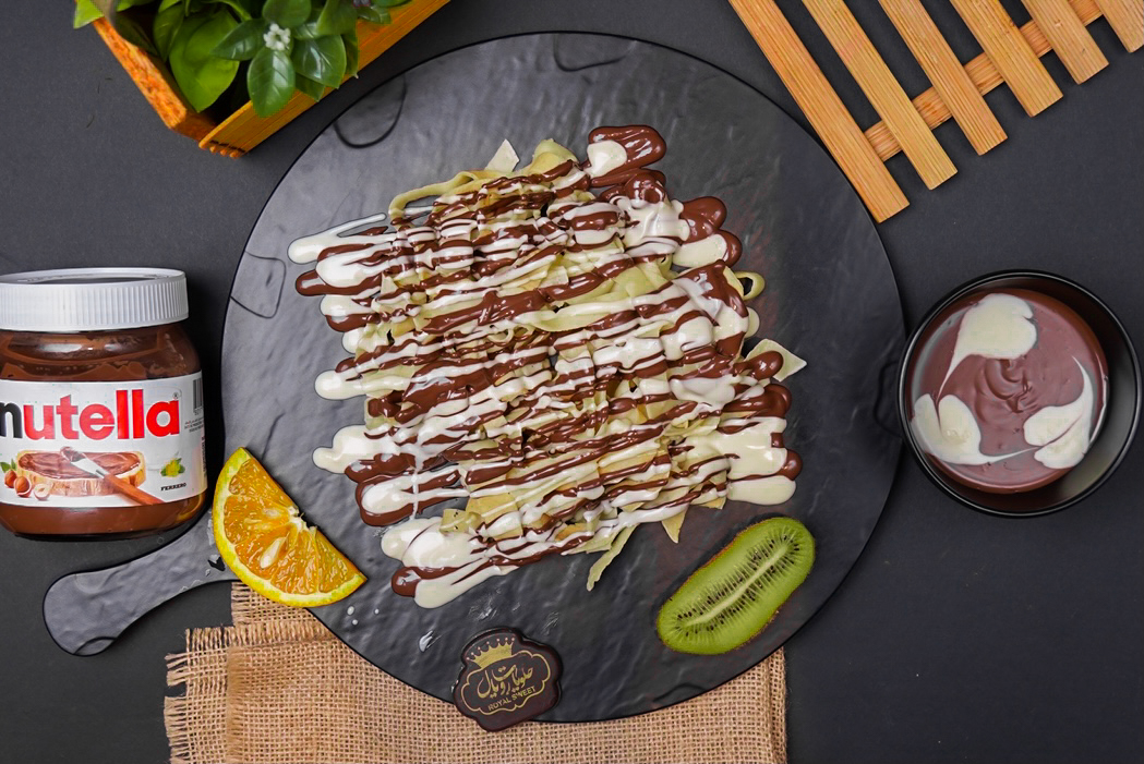 كريب مقطع على شكل باستا مغطى بصوص الشوكلاته وبعض قطع الفواكه